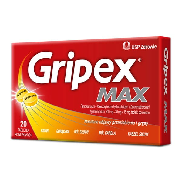 Gripex Max to złożony produkt leczniczy w postaci tabletek zwalczający objawy towarzyszące przeziębieniu lub grypie: gorączkę, ból, katar i kaszel.