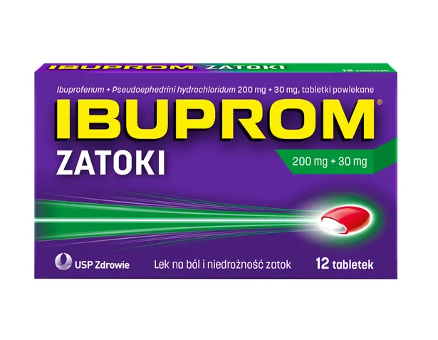 Ibuprom Zatoki to produkt leczniczy o działaniu przeciwbólowym, przeciwzapalnym i przeciwgorączkowym. Zmniejsza obrzęk błony śluzowej nosa oraz zmniejsza ilość wydzieliny. Udrożnia nos oraz zatoki przynosowe.