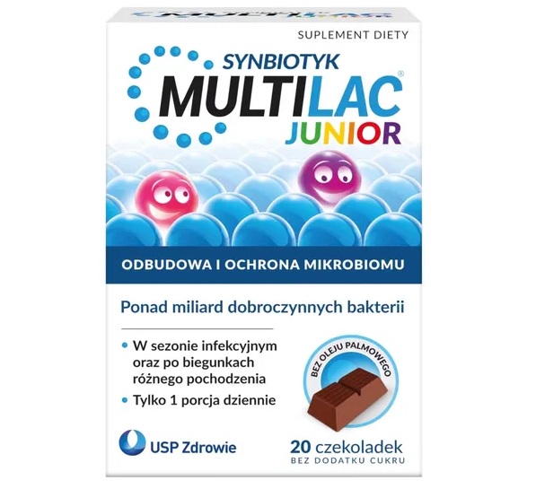 Multilac Junior - to suplement diety dla dzieci powyżej 3. roku życia. Preparat jest połączeniem probiotyku i czekolady.